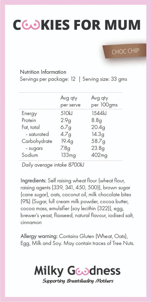 Our Chocolate Chip Lactation Cookies are packed full of natural galactagogues including Flaxseed, Brewers Yeast & Oats which help to boost & support your milk supply while breastfeeding