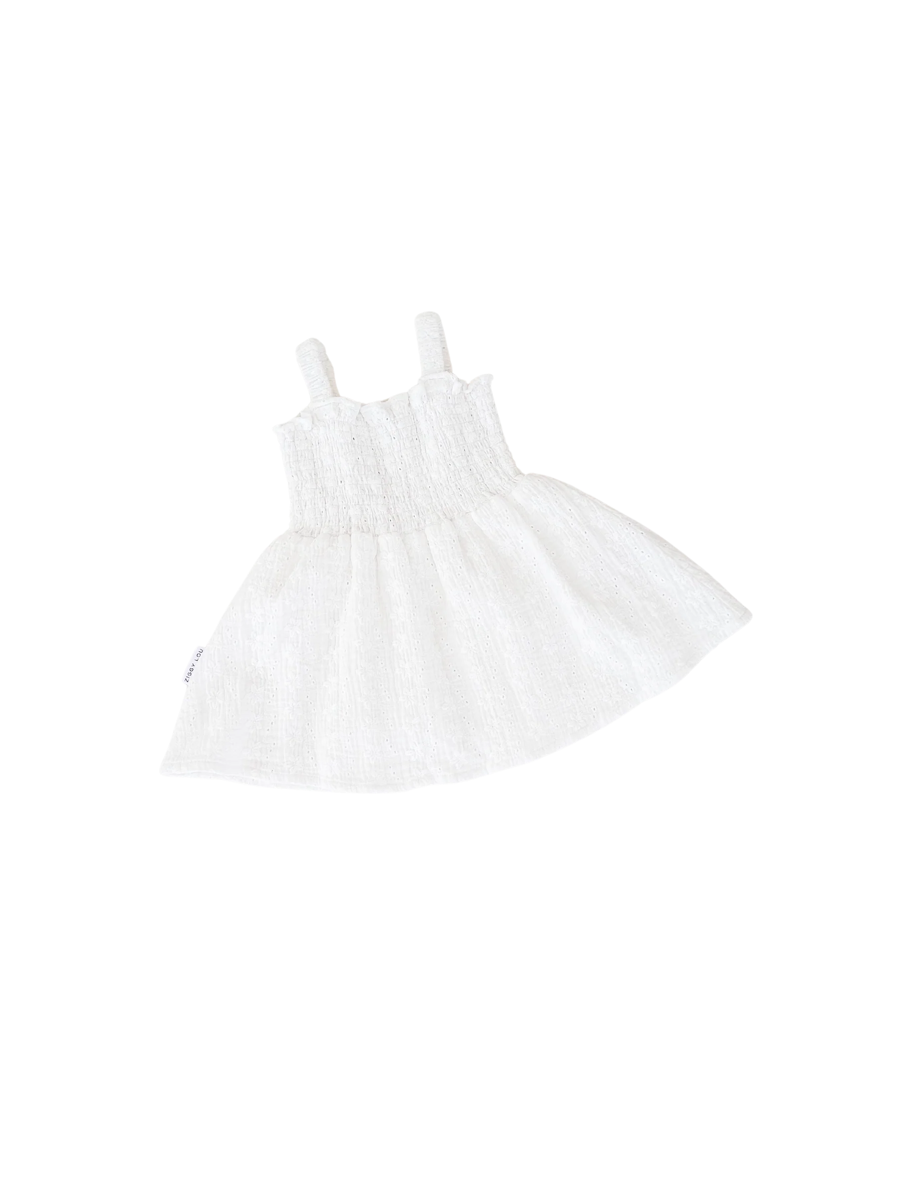 Cotton dress in our Laurel broderie anglaise fabric. Shirred bodice with adjustable button hole straps. Mix and match with items from our Christmas Collection.