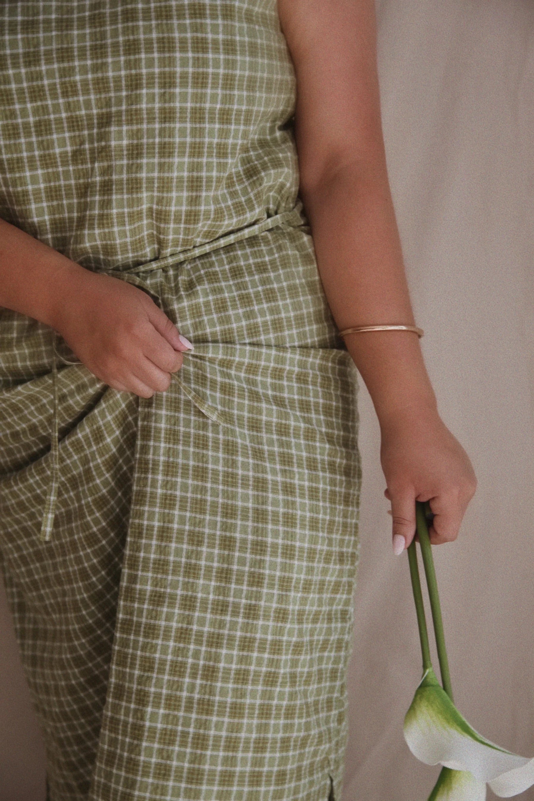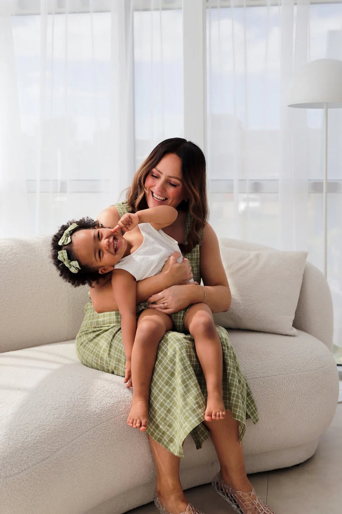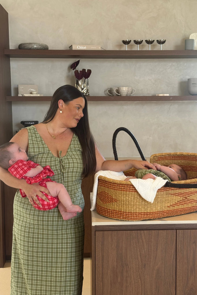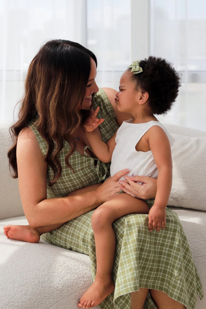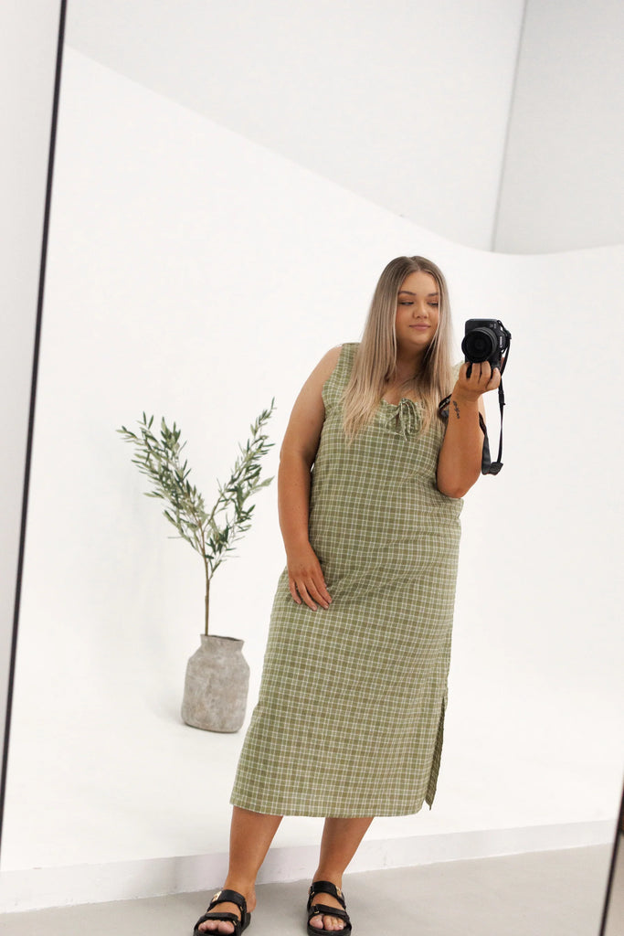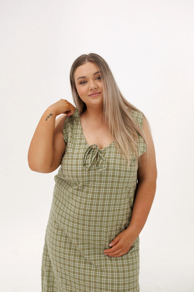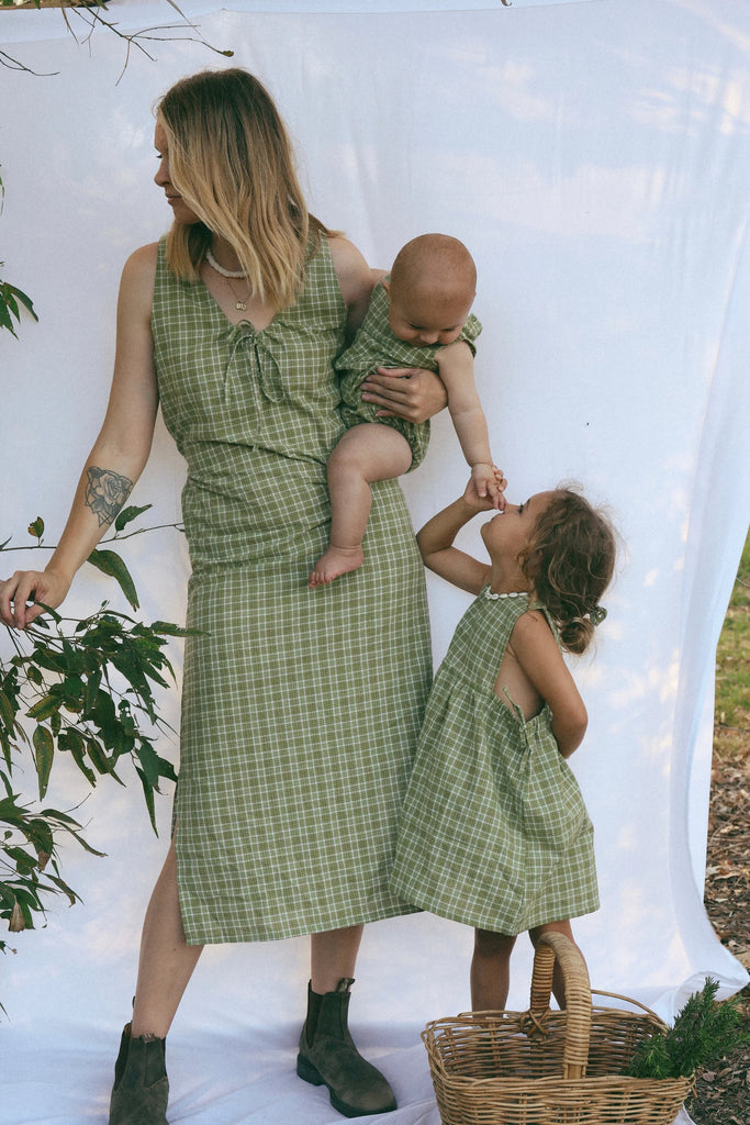 Lightweight cotton dress featuring our Thyme print. Breastfeeding friendly with invisible zips on either side. Adjustable chest tie at front and waist ties at the back allow for a flexible and customisable fit. Option to reverse dress and have tie at back or front.