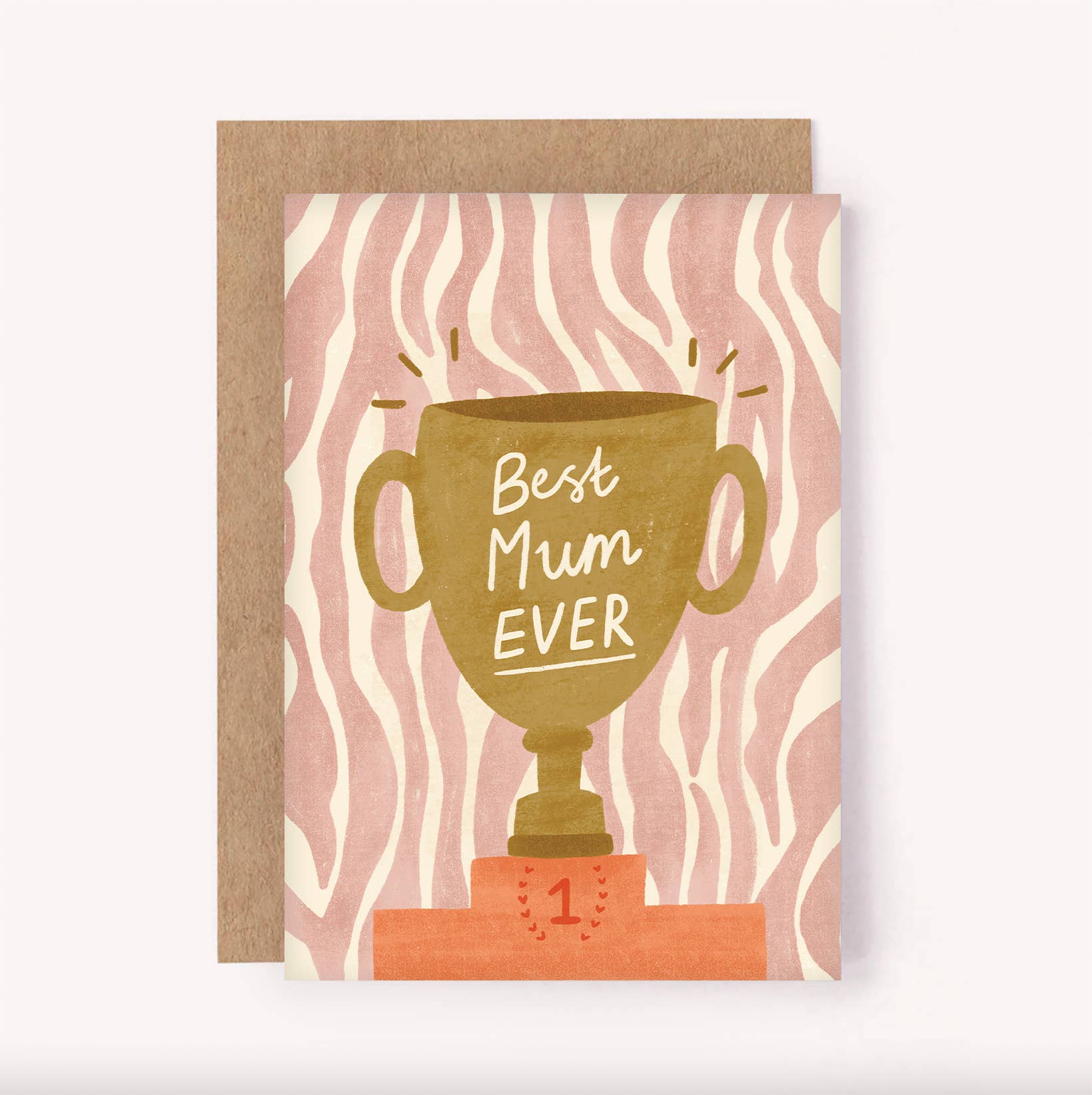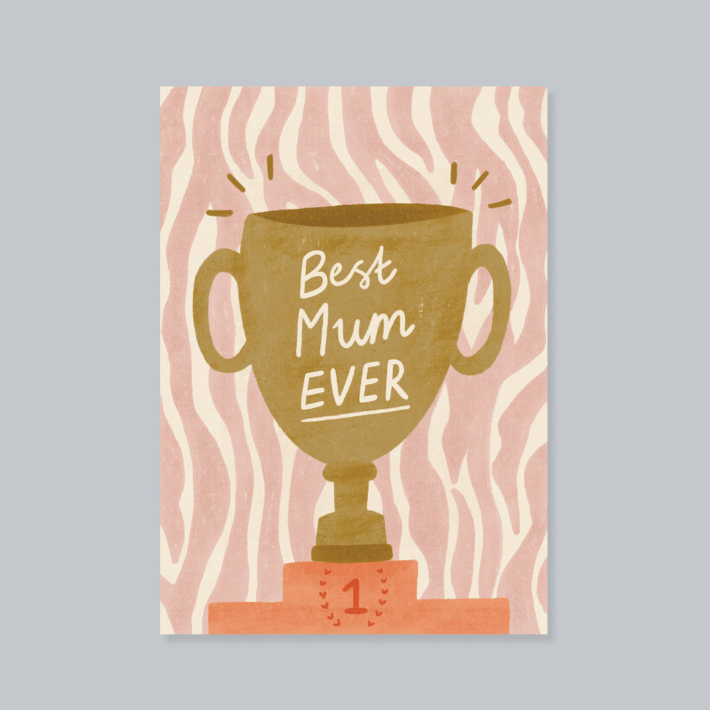 Let Mum know she's the best with this illustrated "Best Mum Ever" trophy greeting card. Featuring a gold trophy set against a bold pink zebra background, this fun design is perfect for Mother's Day, Mum's birthday or just telling her that you appreciate her, any time of year. Blank inside for a personal message