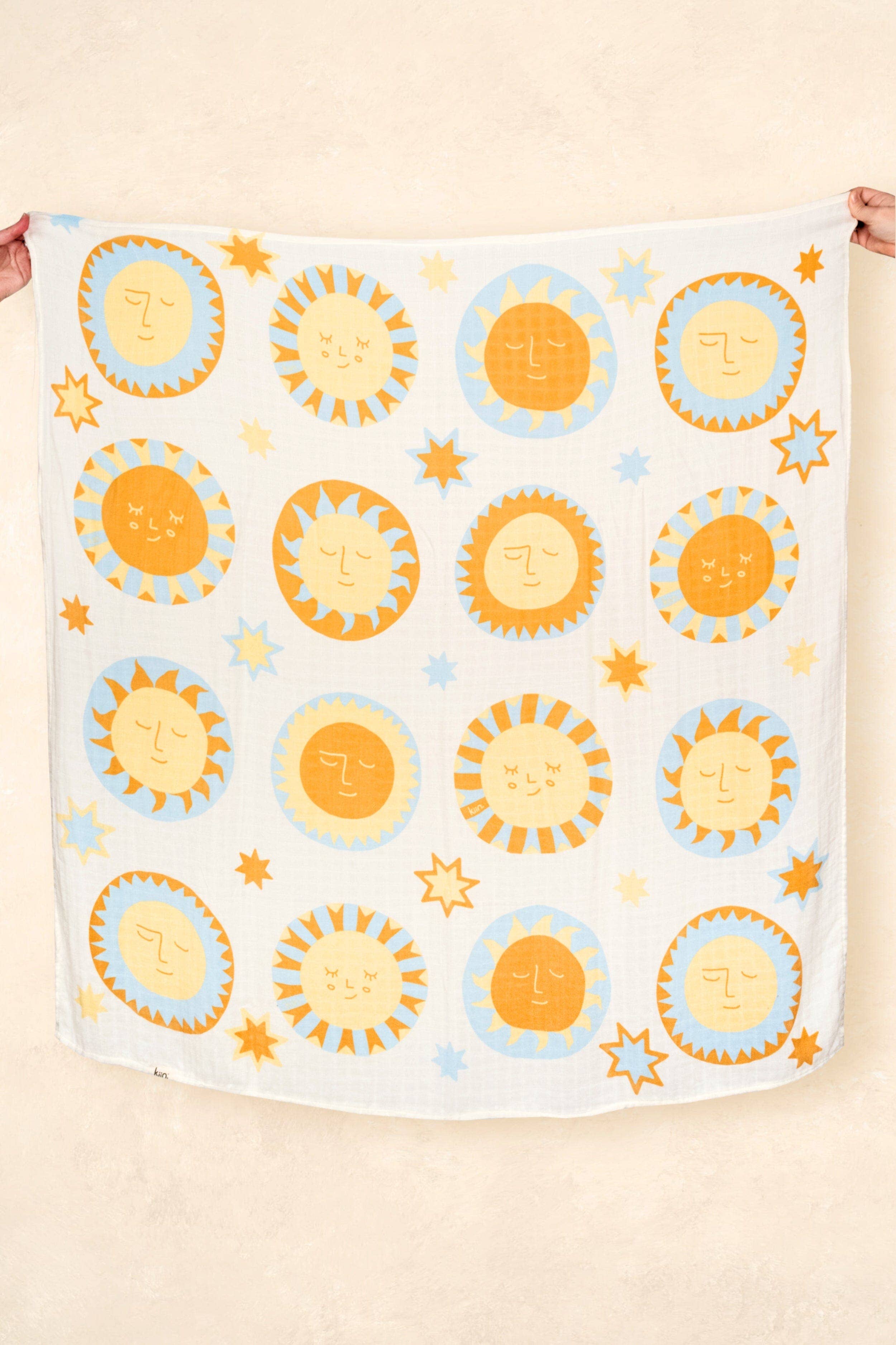 Now available in a limited edition Sunny Day print, this swaddle features a dreamy scattering of sleepy suns and twinkling stars. With soft, sun-warmed tones inspired by summer days, this design is both gender neutral and timeless, making it a beautiful keepsake for every baby.