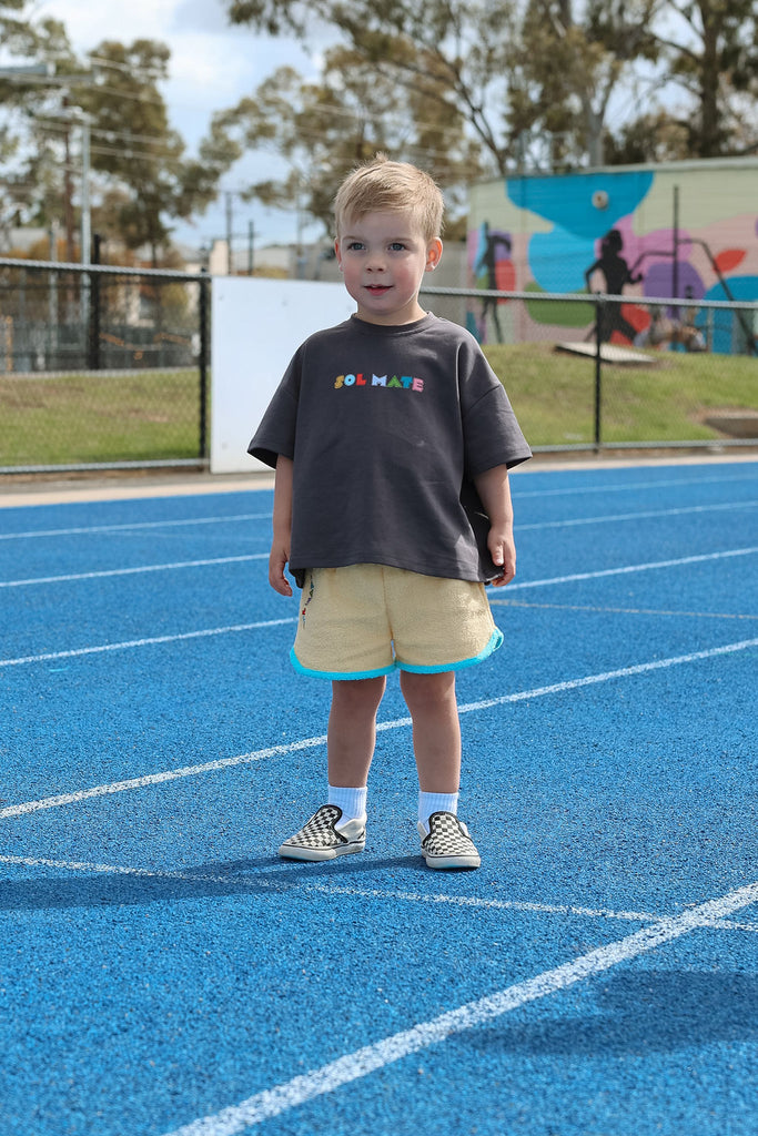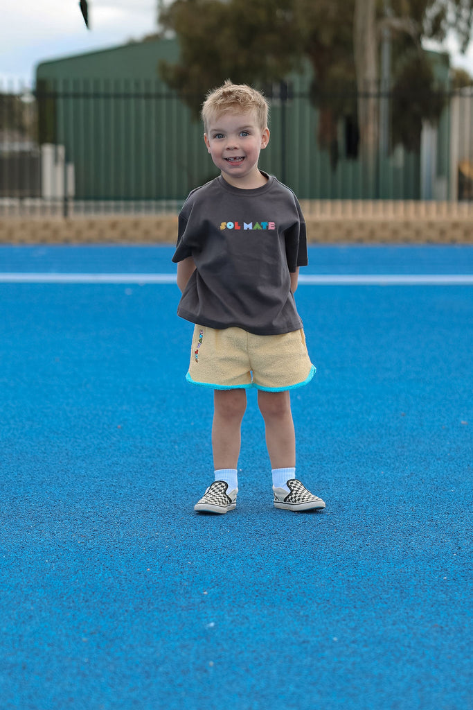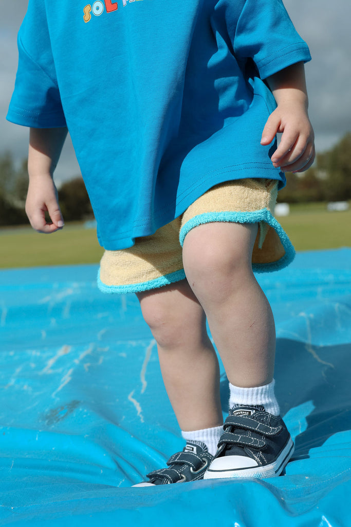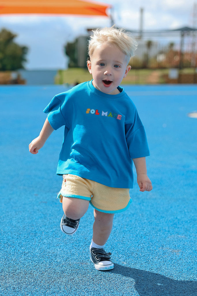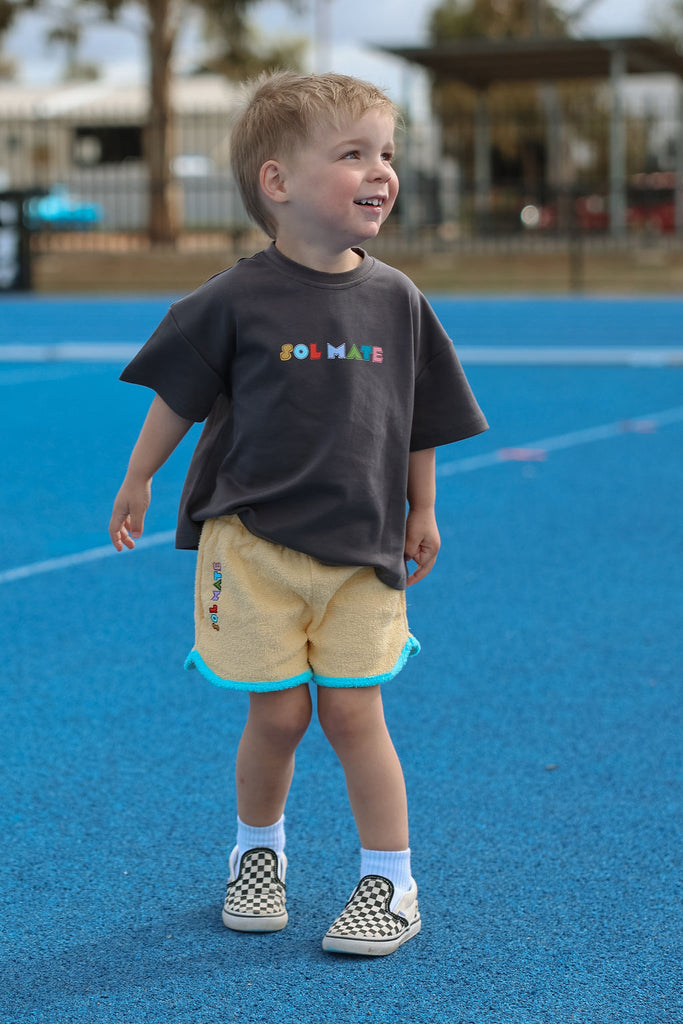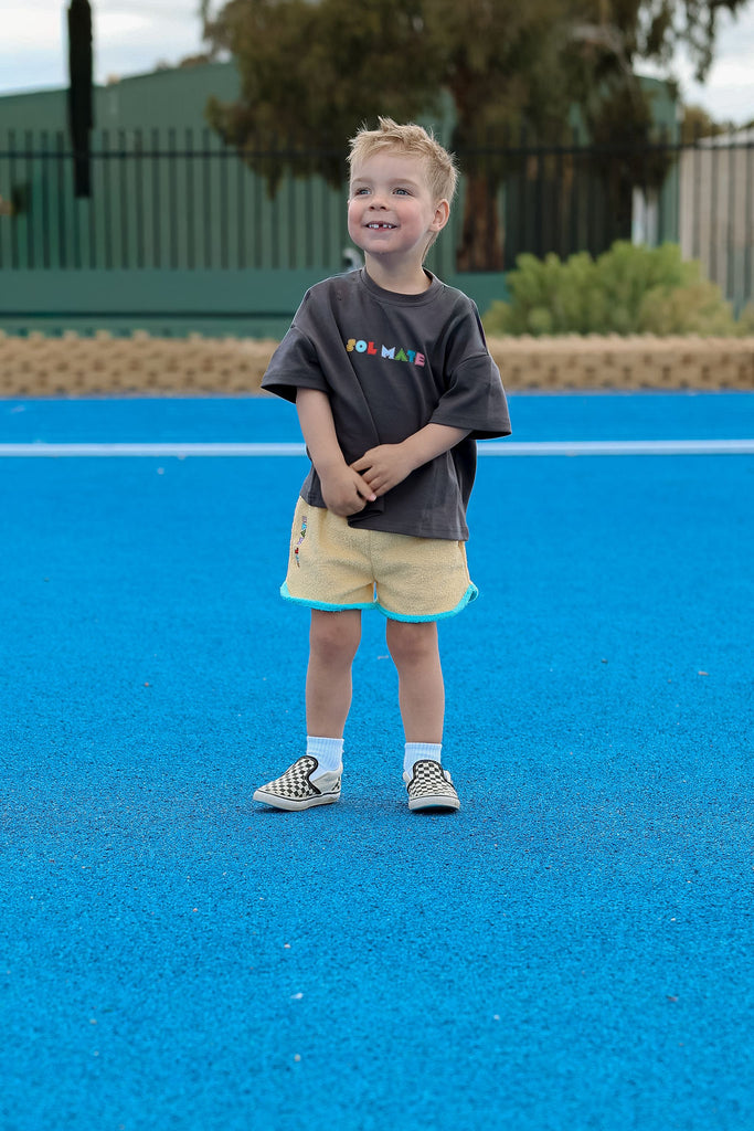 Soft, comfy, and made for all the fun stuff. These terry towelling shorts are a total summer staple, featuring side pockets, contrast trims, and our iconic SOLMATE embroidery. Designed to mix and match perfectly with our Colour Club Essentials Tees for the ultimate play-ready look.