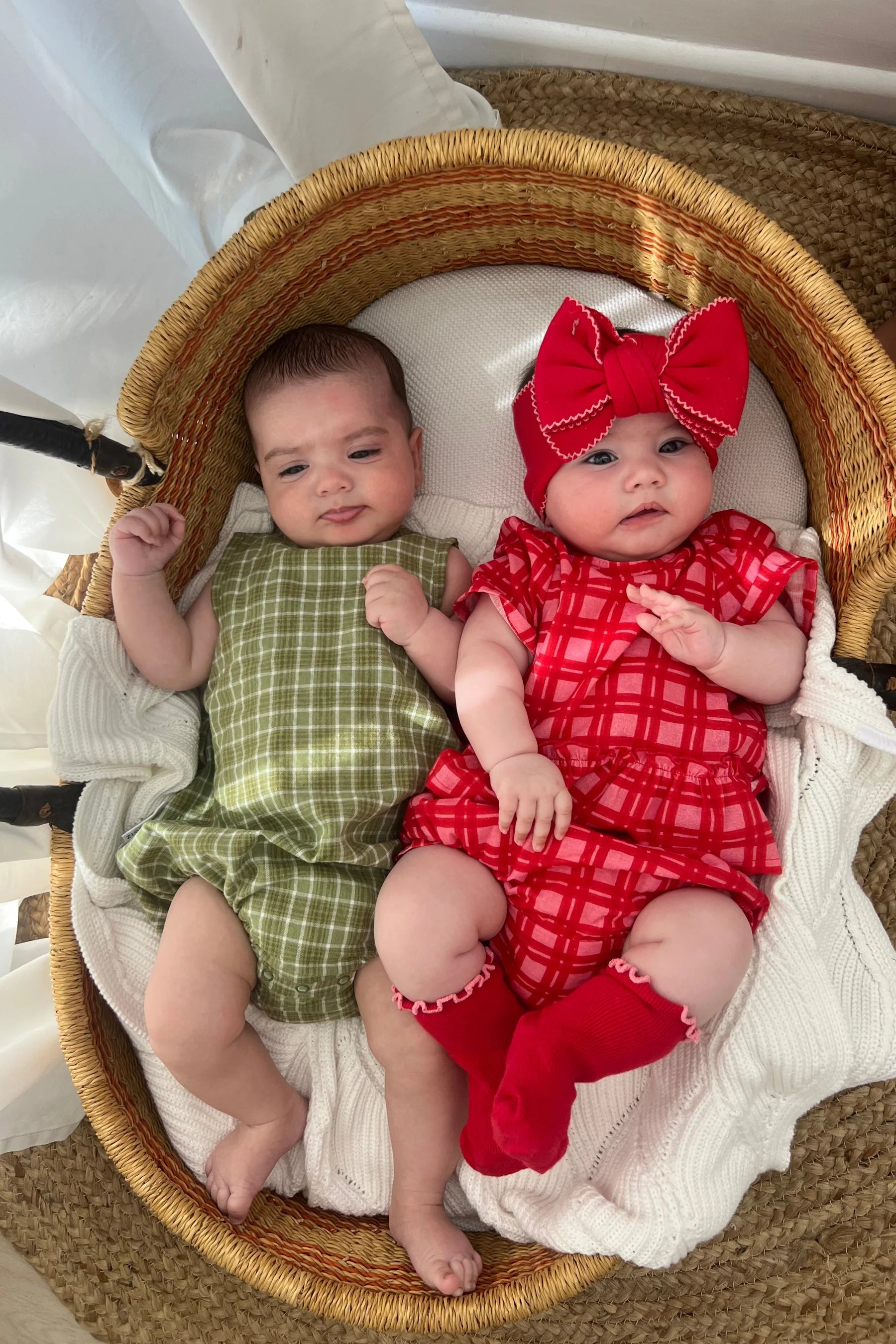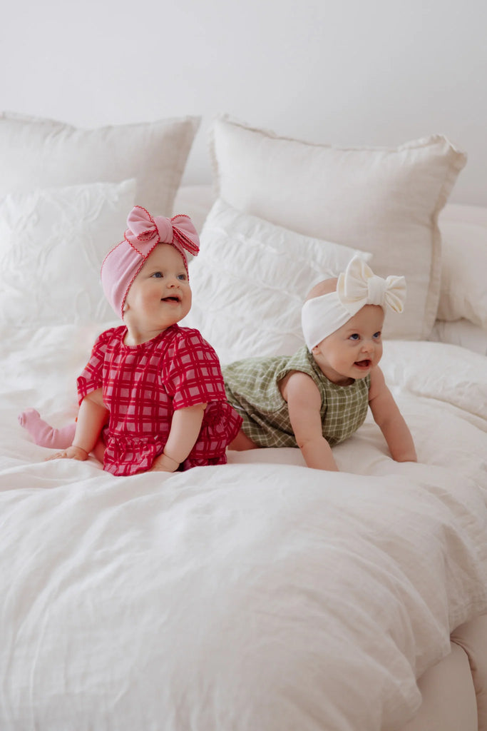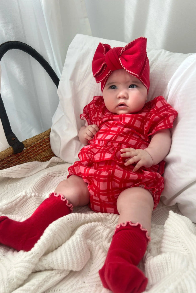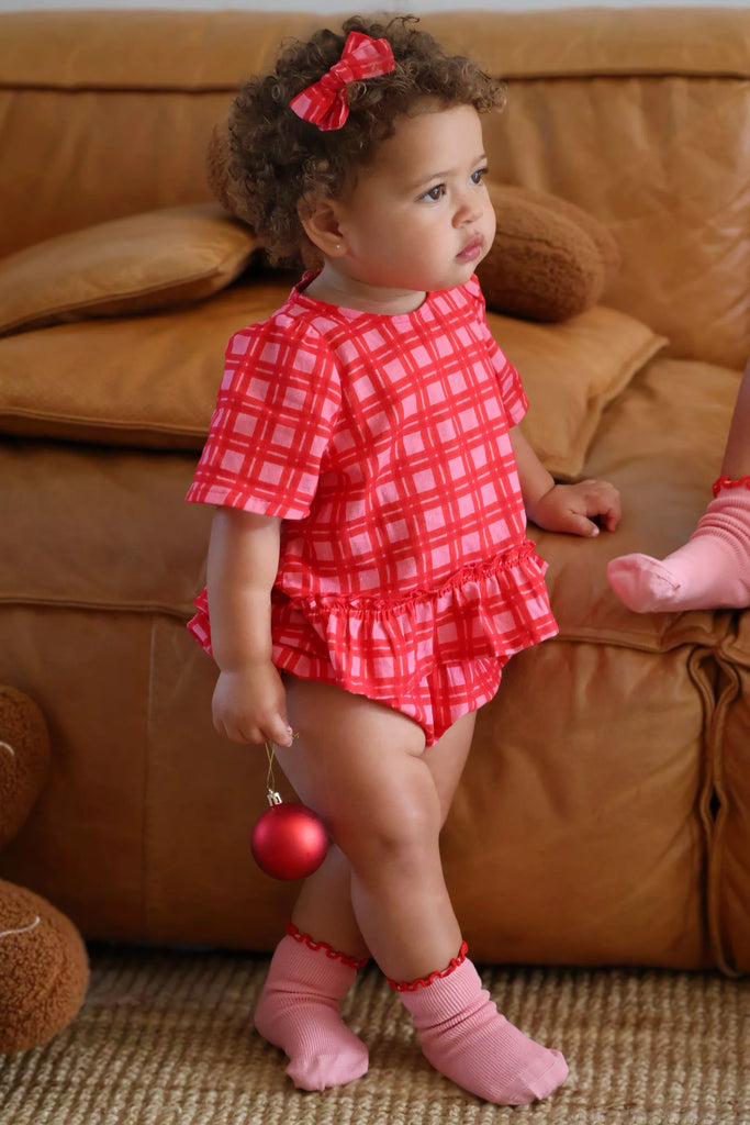 Cotton short sleeve top featuring our exclusive Jolie print. Functional button on the back of the neck for easy on/off, ruffle frill hem detail at waist. Mix and match with items from our Christmas Collection.